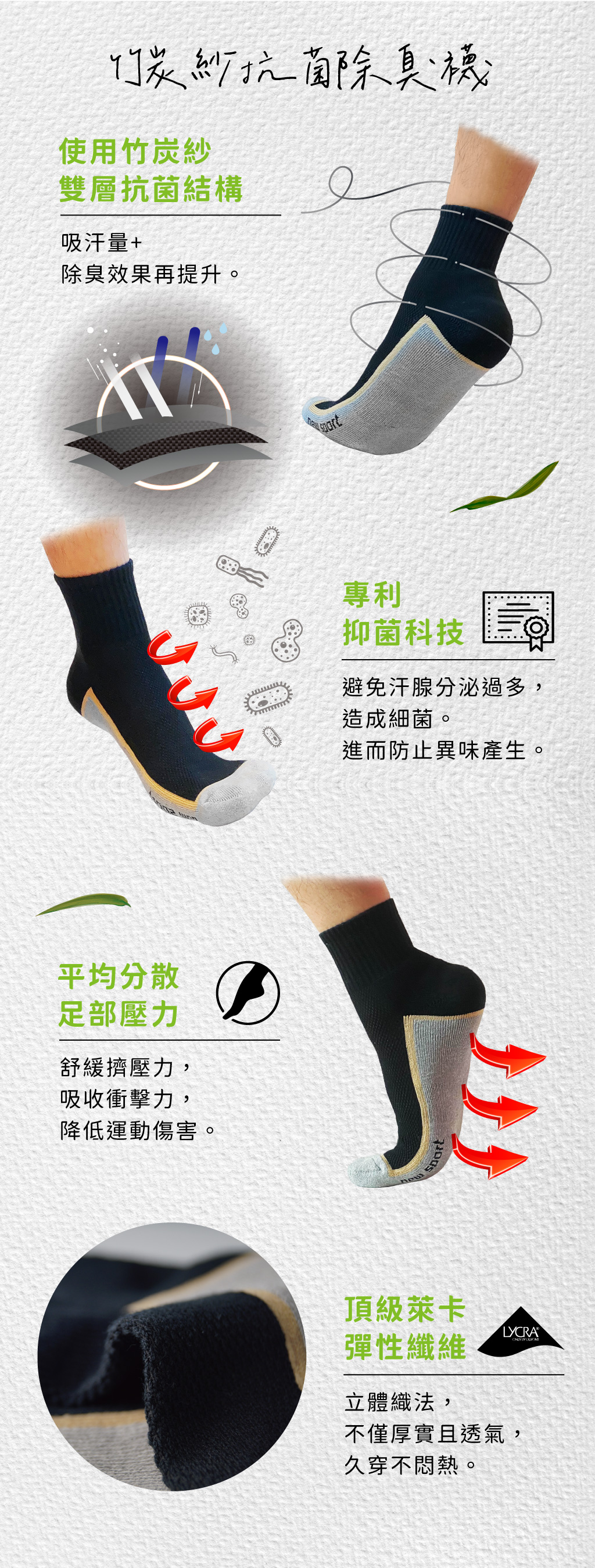 #竹炭系列 #竹炭紗 #吸汗除臭 #襪口加強 #萊卡彈性 #超纖透氣 #立體織法